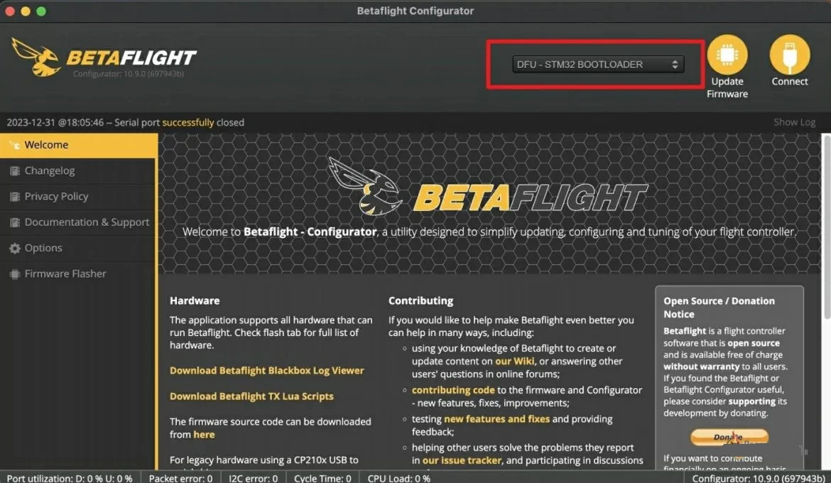 - Обновите прошивку: Ваш полетный контроллер теперь находится в режиме DFU и готов к обновлению прошивки.