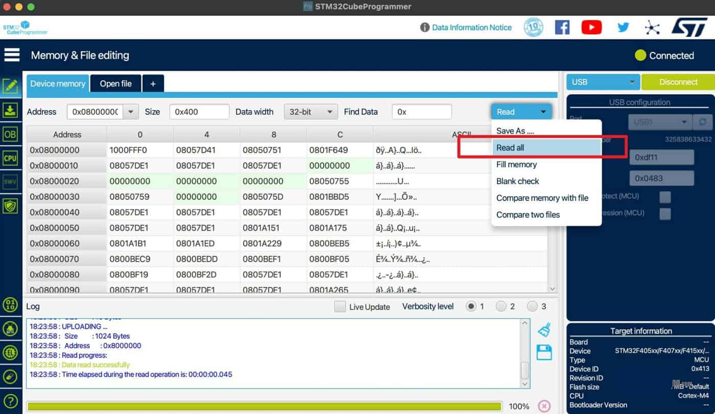После соединения выберите пункт Read all («Читать все»). В этом случае будет полностью считано содержимое памяти процессора, которое может быть затем сохранено.
