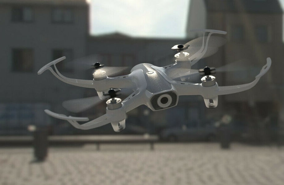 Расцветка беспилотника бело-серая, при этом на пропеллерах имеются красные полосочки.